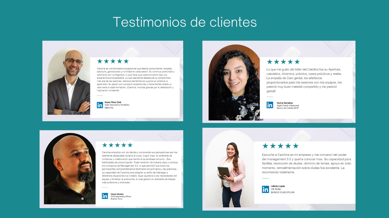 Mi encuentro con las organizaciones ágiles y el management 3.0 marcó un punto de inflexión en mi carrera. Desde ese momento, he dedicado mi tiempo y esfuerzo a transformar organizaciones desde el corazón: las personas.